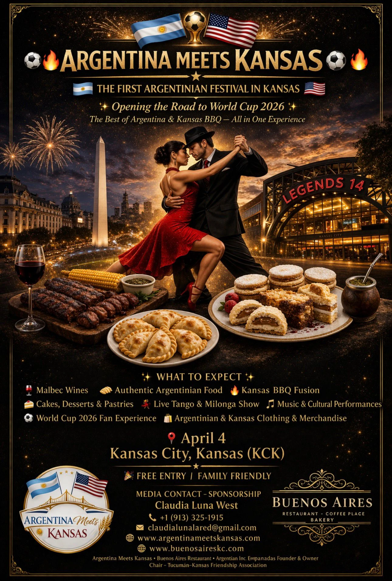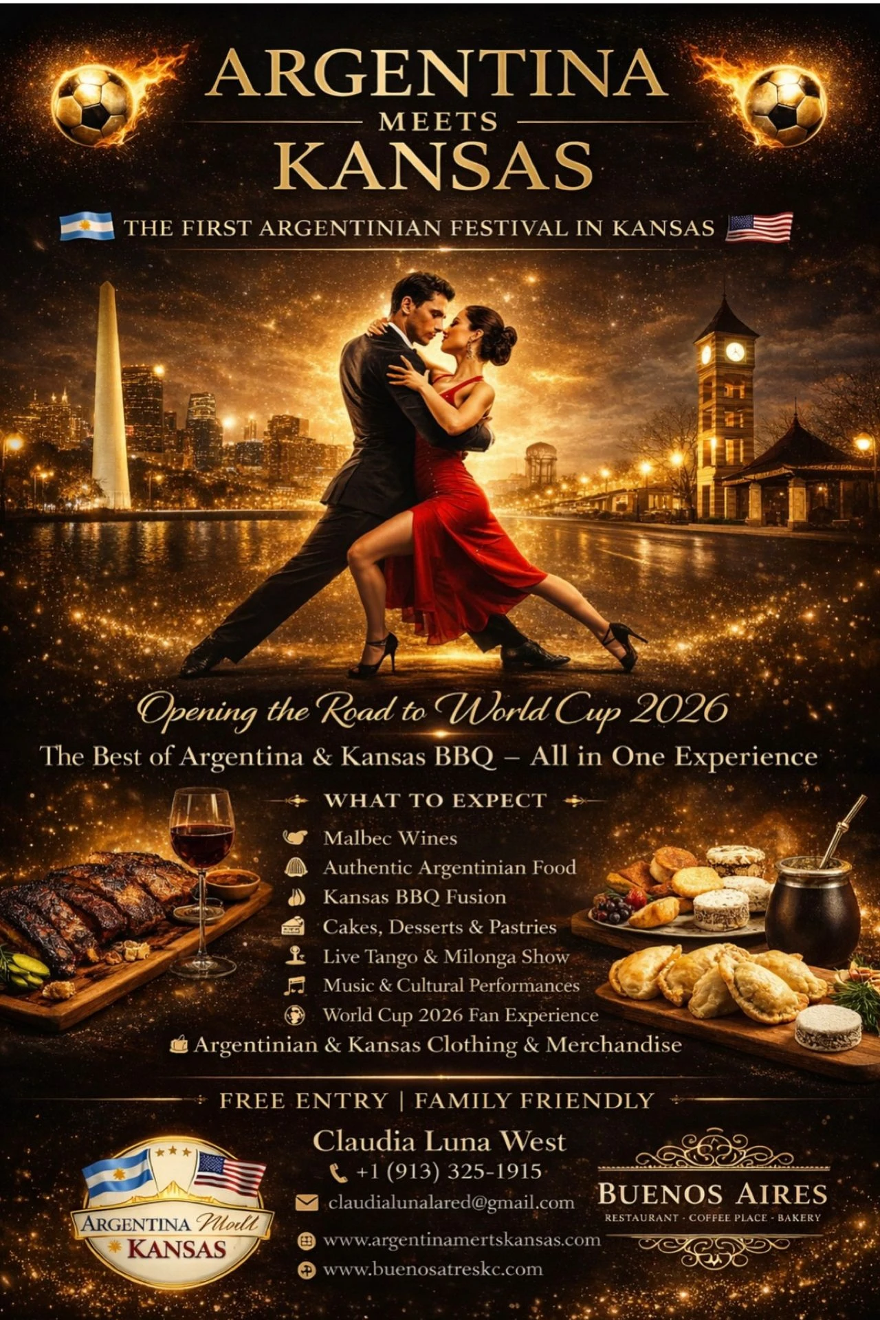 Guests enjoy a unique culinary fusion featuring authentic Argentinian empanadas, traditional choripán sandwiches, artisanal desserts, and Argentina’s world-renowned Malbec wines, paired with the best Kansas barbecue and classic American sides.